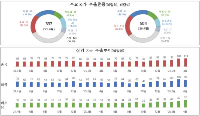 국가별로는 주요 시장에서 고른 증가세가 나타났다. 중국 수출은 70.9%, 미국 51.7%, 베트남 79.2% 증가했으며, 이들 3개국이 전체 수출의 절반 이상인 51.8%를 차지했다. 유럽연합과 대만 등으로의 수출도 증가 흐름을 보였다.
