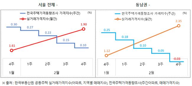 주간 아파트 가격지수가 같은 기간 상승세 둔화를 보인 것과 달리, 실거래가격지수는 상승폭이 확대되며 상반된 흐름도 확인됐다. 특히 동남권은 주간지수 기준 하락 전환 움직임을 보였지만, 실제 거래가격은 상승폭이 커지며 시장 체감과 통계 간 괴리가 나타났다. 이는 1월 토지거래허가 신청가격 상승이 시차를 두고 반영된 영향으로 분석된다.