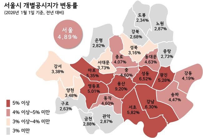 서울시가 2026년도 개별공시지가를 공시하고 평균 4.90% 상승과 명동 상업지의 최고가 기록 지속을 밝혔다.